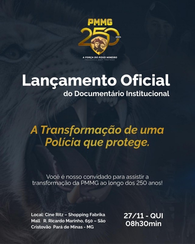 A Polícia Militar de Minas Gerais, de forma simultânea em todo o Estado, vai realizar nesta quinta-feira, dia 27 de novembro, às 8h30, o lançamento oficial do seu documentário institucional ‘A Transformação de uma Polícia que Protege’. Em Pará de Minas, a 19ª Companhia Independente exibirá o documentário no Cine Ritz do Shopping Fabrika Mall, localizado no bairro São Cristóvão.