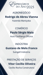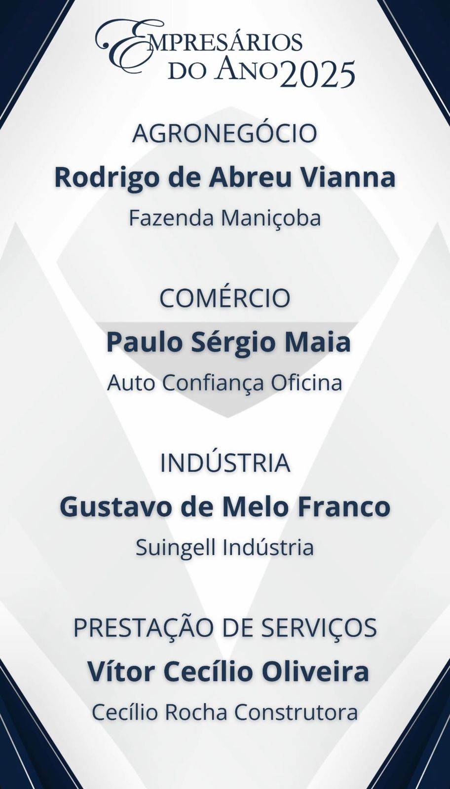A cerimônia anunciou os nomes mais votados, que receberam o título de Empresários do Ano. Foram quatro categorias: Agronegócio, Comércio, Indústria e Prestação de Serviço. Entre os empresários nomeados está o Paulo Maia da Auto Confiança, eleito na categoria comércio: