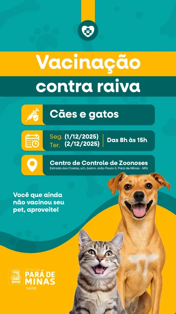 O evento Saúde nos Bairros realizará a vacinação antirrábica de cães e gatos em Pará de Minas. De acordo com a Secretaria Municipal de Saúde, a ideia é imunizar parte da população canina na cidade com intuito de prevenir possíveis impactos na saúde.O Médico Veterinário Oscar Leitão, referência técnica do Centro de Controle de Zoonoses (CCZ), fala sobre a disponibilização do serviço e da repescagem da imunização nos dias 1º e 2 de dezembro: