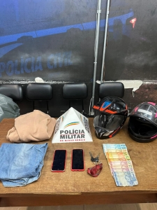 Durante as buscas foram apreendidos os capacetes e as roupas utilizadas na ação criminosa, a motocicleta, cor preta, dois celulares e a quantia de R$ 359,00 em dinheiro, além do carro roubado.