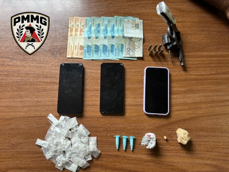 Durante buscas no local foi localizada uma arma de fogo marca Taurus, calibre 32, seis munições intactas, uma bucha de maconha, dois comprimidos de ecstasy, duas pedras de crack, 39 papelotes e três pinos de cocaína, R$950,00 em dinheiro e três aparelhos celulares. Foi apreendida também uma motocicleta, que foi removida ao pátio do Detran-MG.
