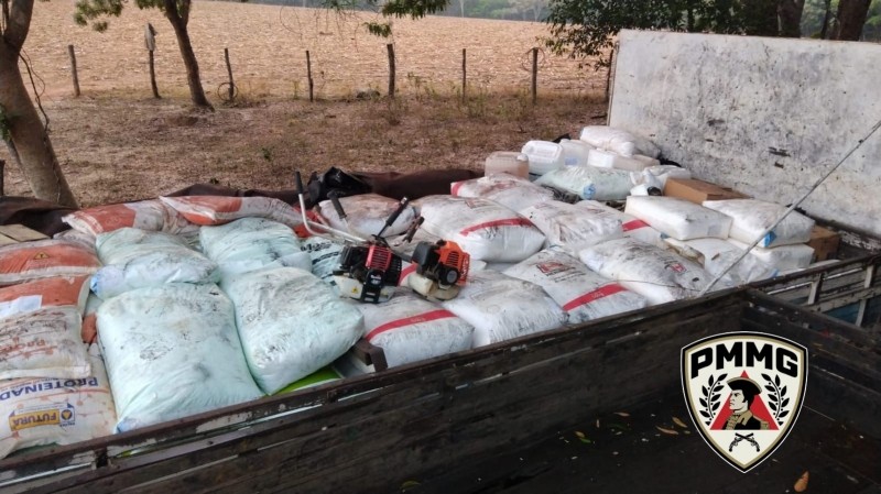 Os militares localizaram uma propriedade rural utilizada para ocultar os materiais furtados, onde encontraram um caminhão com a carga de insumos, defensivos e ferramentas escondida sob uma lona, em uma mata.